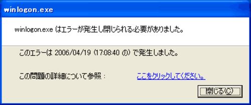 作業中に winlogon.exe がエラーはいて、その後勝手に再起動した。 winlogon.exe はエラーが発生し閉じられる必要がありました。 このエラーは 2006/04/19 (17:08:40 の) で発生しました。